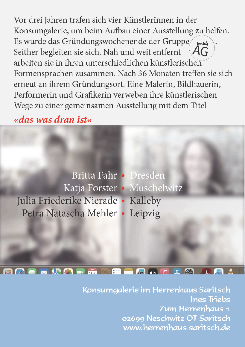 Am Samstag, den 9. Mai 2026 um 16 Uhr findet die erste  Ausstellungseröffnung im Jahr 2026 mit dem Titel „das was dran ist“ statt. Ausstellen wird die