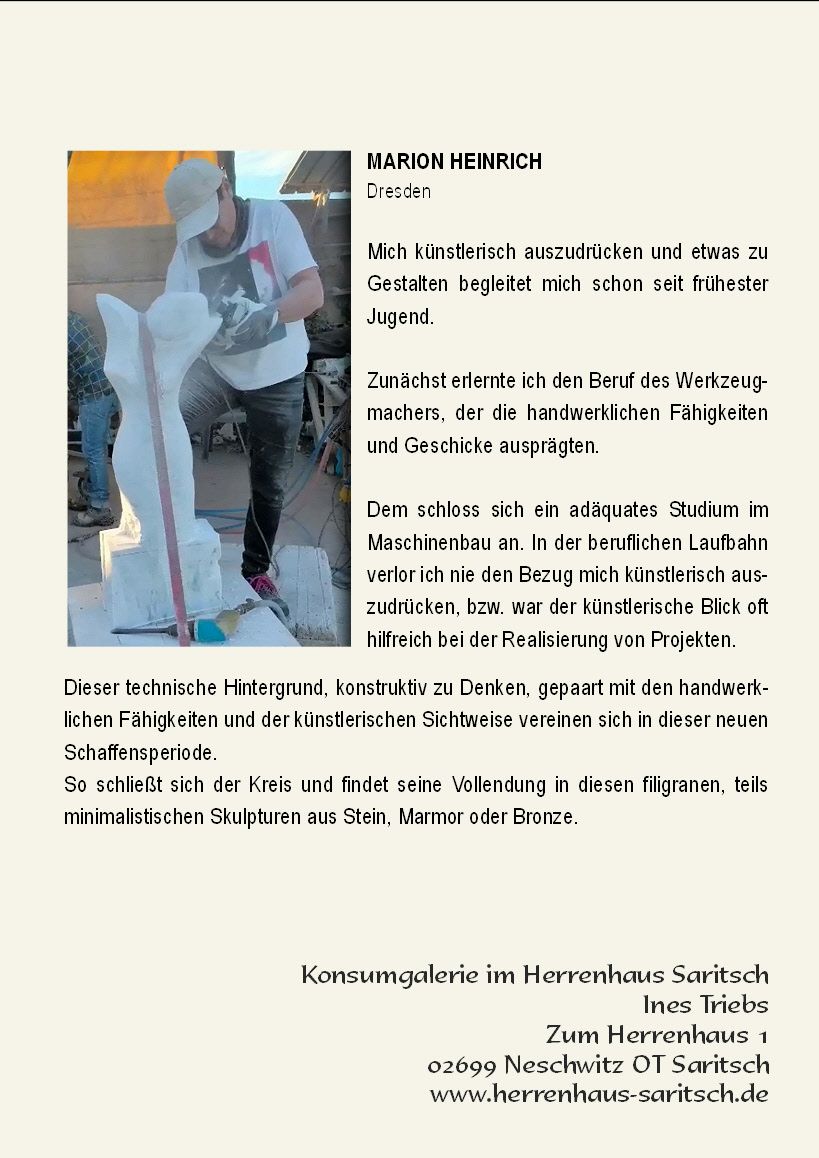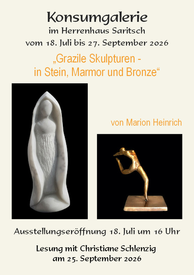 Am Samstag, den 18. Juli 2026 um 16 Uhr findet die zweite Ausstellungseröffnung im Jahr 2026 mit dem Titel: Grazile Skulpturen – in Stein, Marmor und Bronze“ statt. Ausstellen wird die Marion Heinrich aus Dresden.